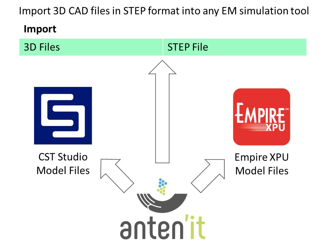 Export 3D STEP files, import them into any electromagnetics simulation tool, enter the material properties, assign ports, arrange the simulation settings